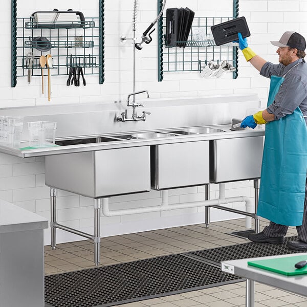 Outfit your facility with a long-lasting sink that will meet your needs with this Regency 112" stainless steel three compartment sink with 2 drainboards. This durable sink is made with high-quality, welded 16 gauge type 304 stainless steel for durability, corrosion resistance, and long-lasting use. This sink features a 34" work surface height and 2 sturdy 24" drainboards, allowing you to easily wash and dry dishes and utensils in one convenient location. It's also dipped a minimum of 1/4" to facilitate better drainage. This item's 1 5/8" diameter stainless steel legs with stainless steel cross bracing, sockets, and bullet feet provide added stability.