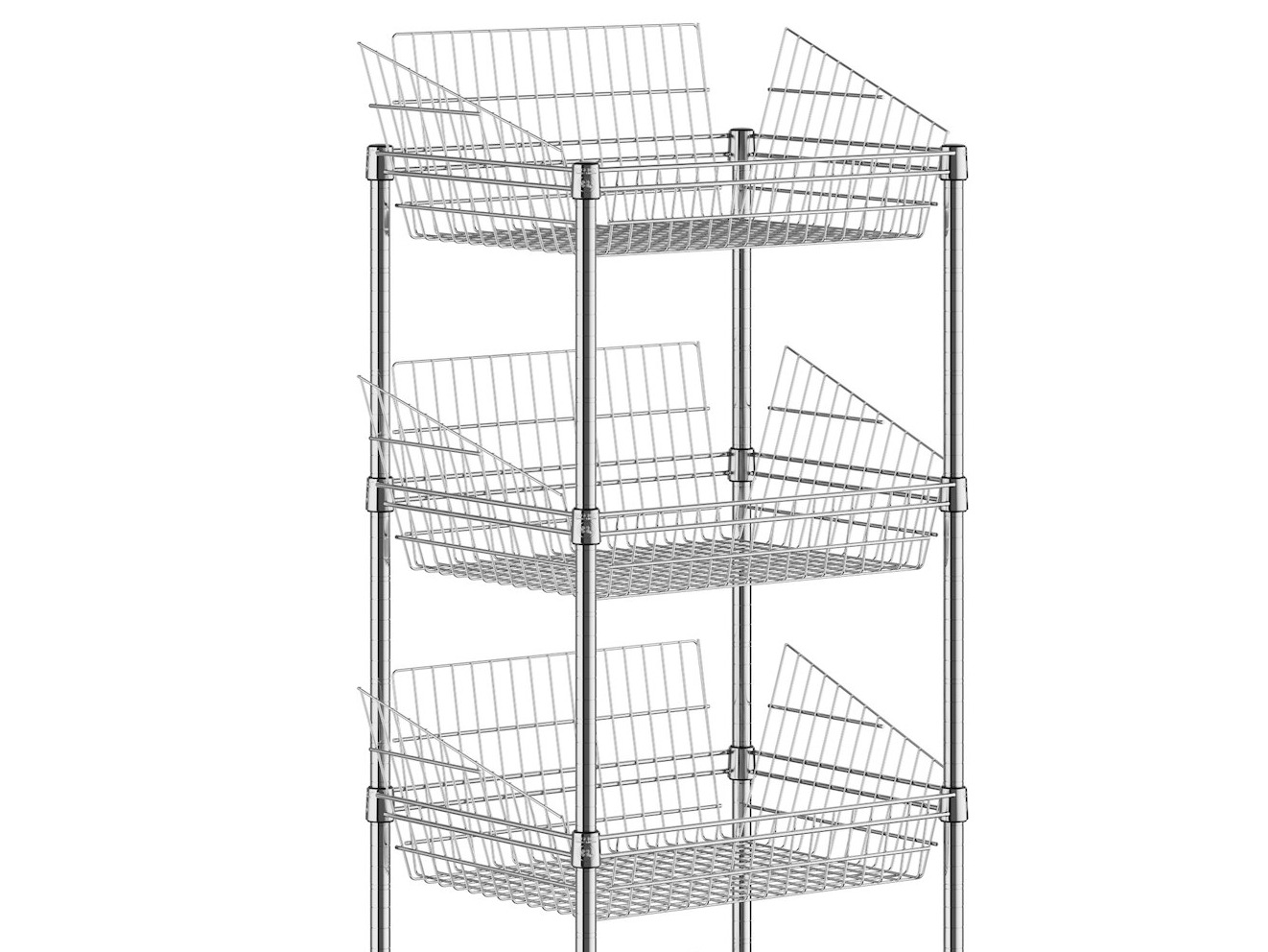 This convenient basket display provides ample storage for bulky items, and it has baskets with slanted sides to show off your product better than traditional baskets. This storage basket display can also be used to store impulse items, overstock items for quick selling, or to store supplies for your staff.