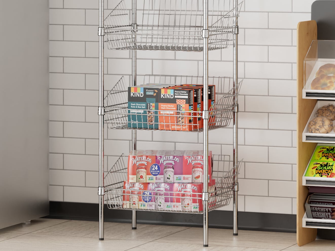 This unit features 5 storage baskets with a drop front and sloped sides that contain products and help prevent them from falling out while providing easy access.