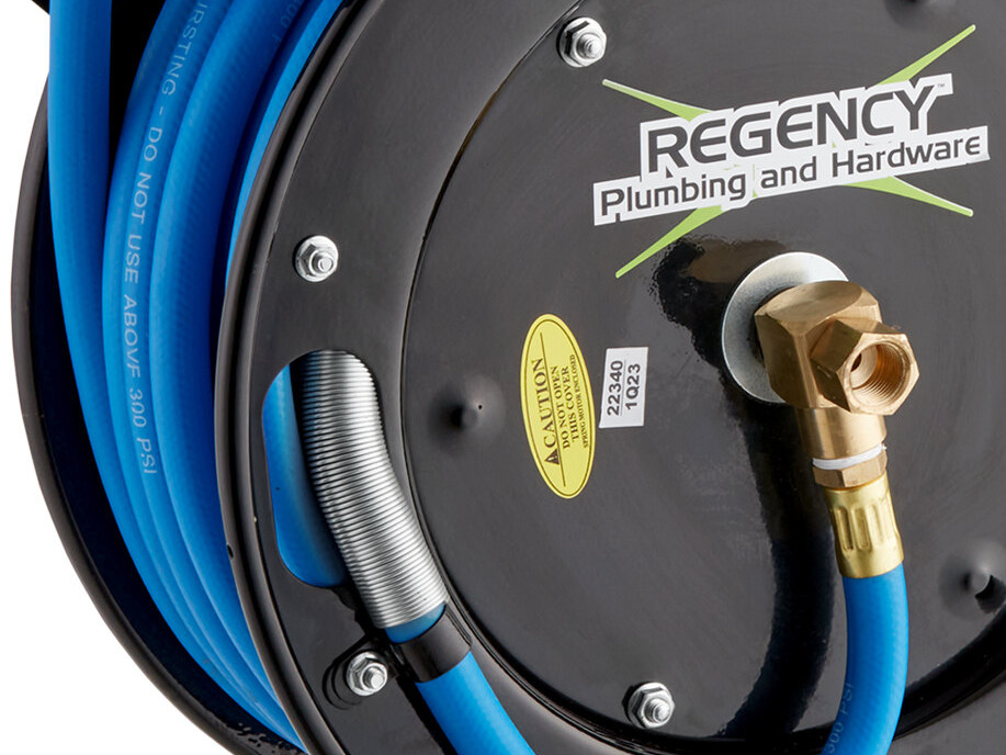 Equip your business with the Regency open powder-coated steel hose reel with a hose and spray water gun! With a multi-fit bracket, the base is built to mount on a wall or floor for convenient access in janitorial locations and commercial kitchens. This unit has a 3/8" inlet and outlet, and it is rated to 300 PSI.