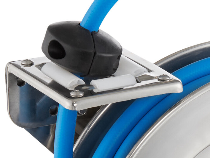 - Durable stainless steel reel houses 35' hose