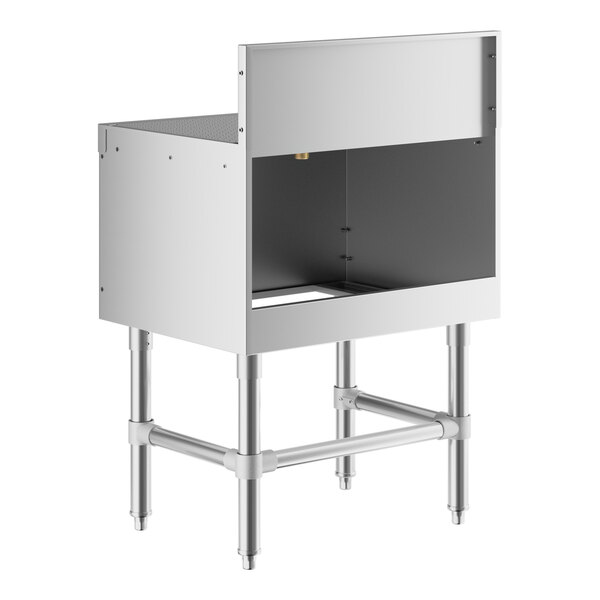 The sturdy stainless steel legs with U-shaped cross bracing and plastic bullet feet ensure stability during use. This stainless steel underbar drainboard has a durable and efficient design, making it the perfect addition to your restaurant or bar.