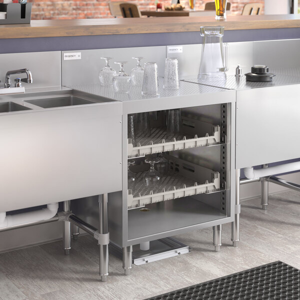 With durable stainless steel legs and bullet feet, this glass rack storage unit keeps glass racks up off of the floor for sanitary storage. Plus, the legs give you enough clearance to clean beneath the cabinet for added convenience.