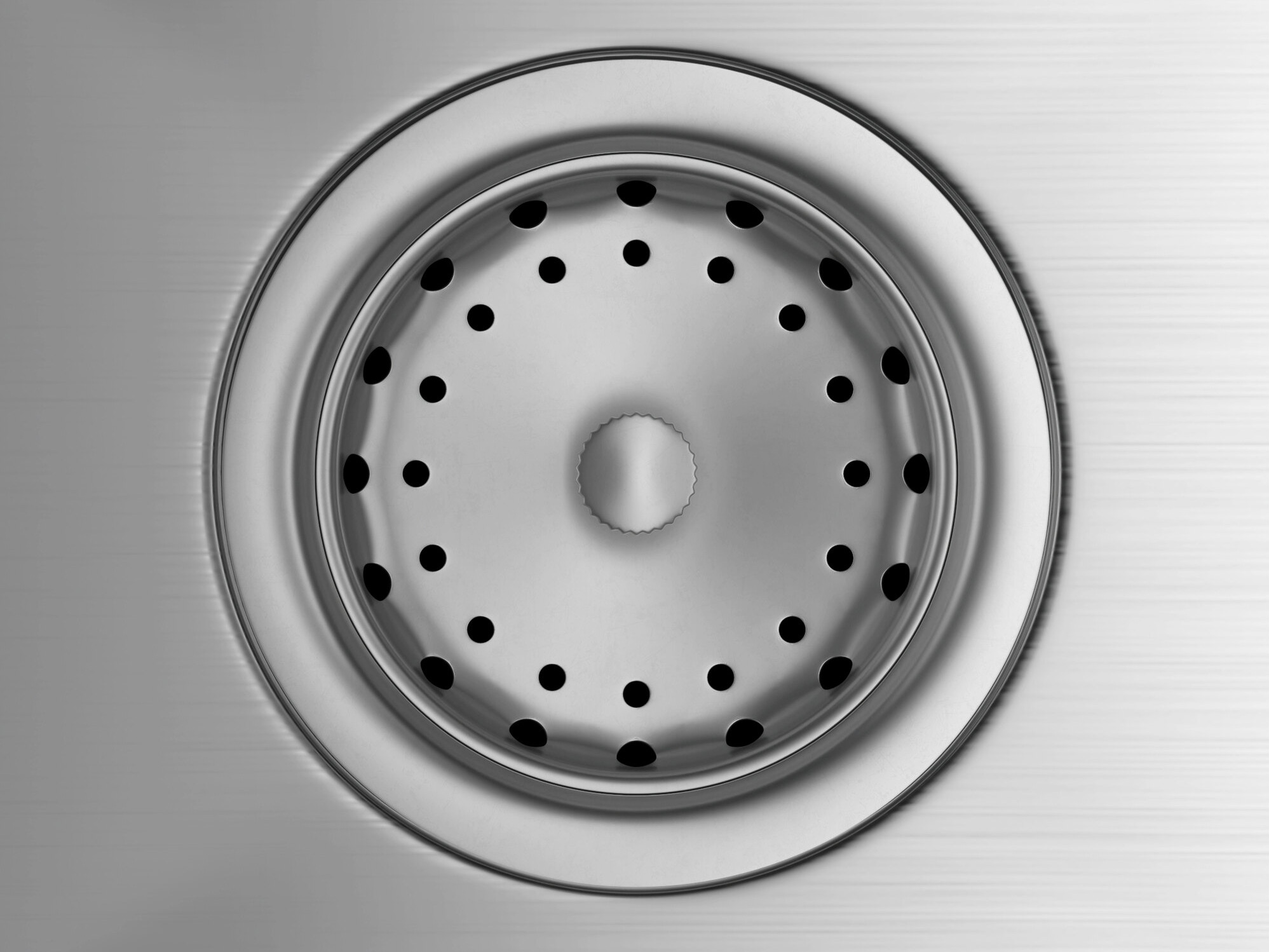 This sink comes with a 3 1/2" basket strainer to catch food debris, which prevents the drain from clogging.