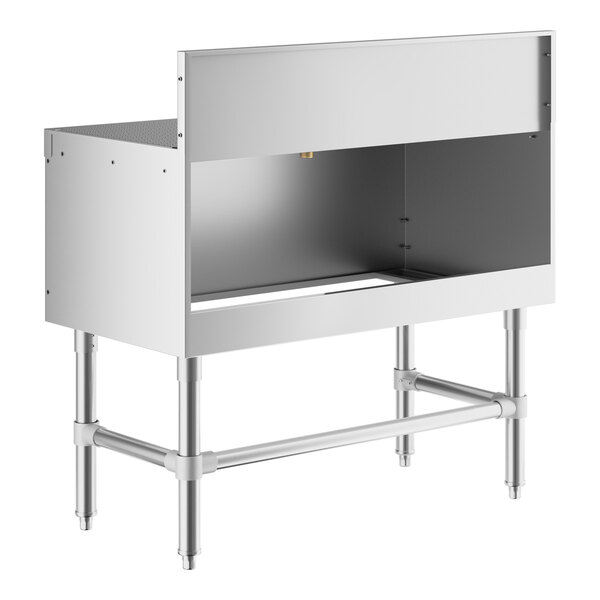 The sturdy stainless steel legs with U-shaped cross bracing and plastic bullet feet ensure stability during use. This stainless steel underbar drainboard has a durable and efficient design, making it the perfect addition to your restaurant or bar.