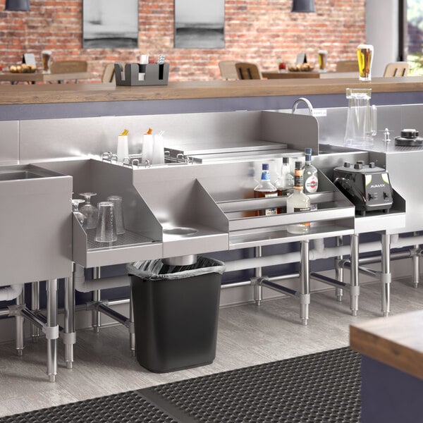 This complete bar station boasts an elixir station that can fit up to 6 bottles and a convenient trash chute that's 10" in diameter. The trash chute can fit trash cans that are up to 18" tall and 11 13/16" wide. Crafted from durable stainless steel, this cocktail station is built to withstand the rigors of a busy bar environment, making it a reliable addition to any commercial bar setting.