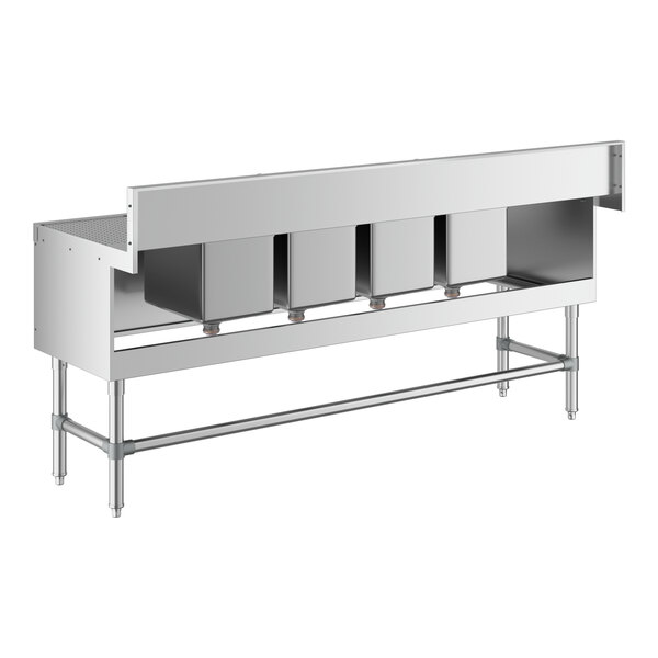 This underbar sink boasts four separate bowls and two drainboards to help you keep up with the demand for glassware at your establishment. It offers a convenient space to wash, rinse, or sanitize dirty glassware from behind your bar. It has a tall 7" backsplash, which helps prevent splashes and overflow, and its 1 1/2" IPS drainage connection safely drains waste water during use. It also comes with an 8" overflow pipe to help prevent flooding.