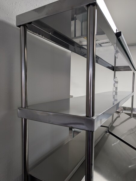 This additional double decker overshelf on my commercial worktop is my favorite part of the whole setup because it’s gave me so much shelf space and it’s built very sturdy, does not wobble and very easy to install. It works perfect in my space without having to screw in shelves to the wall.