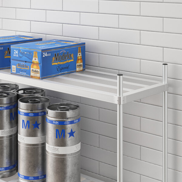 Designed for use with Regency keg racks, this shelf is a perfect replacement for the top shelf on a Regency aluminum keg rack (sold separately), making for convenient adjustment that ensures this unit serves your needs at all times. It is also easy to assemble, so you can get it from the box to the storage room quickly.