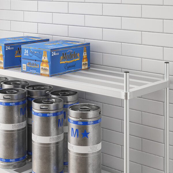Designed for use with Regency keg racks, this shelf is a perfect replacement for the top shelf on a Regency aluminum keg rack (sold separately), making for convenient adjustment that ensures this unit serves your needs at all times. It is also easy to assemble, so you can get it from the box to the storage room quickly.