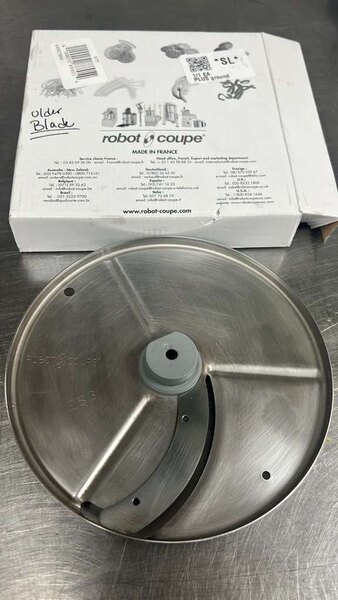 Used in a R2CLR Dice food processor with the continuous feed attachment to cut thinner slices than the original disc (5/32"). It cuts almost paper thin slices in everything, such as thin celery slices.