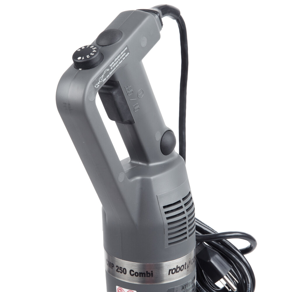 This Robot Coupe CMP250 Combi compact immersion blender processes fruits, vegetables, soups, and sauces with ease, making it a must-have addition to your busy commercial kitchen! This compact unit requires a 120V electrical connection for operation.