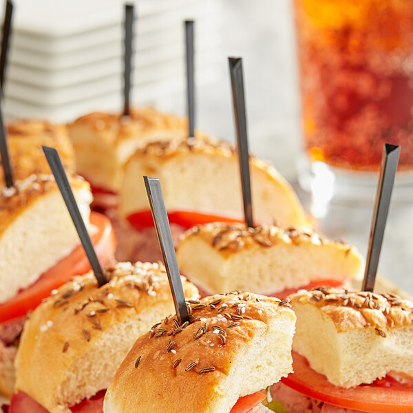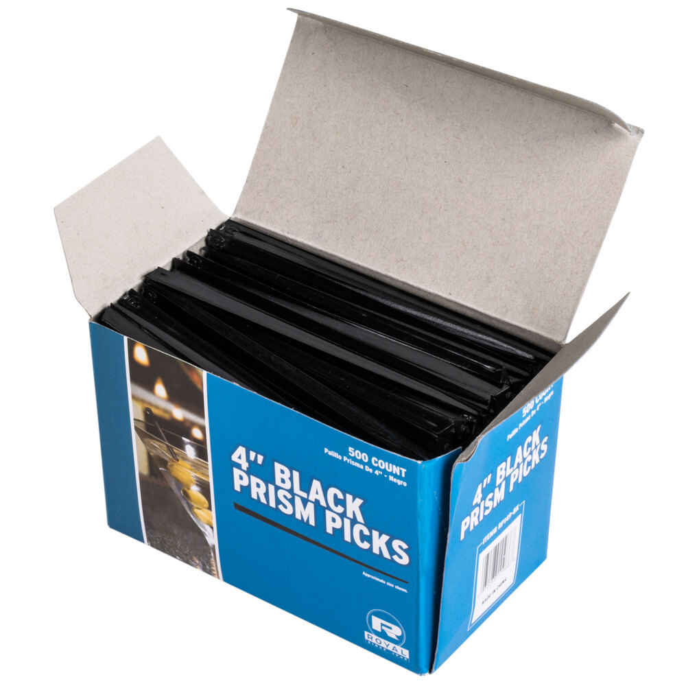 Need a food pick that can be used for a variety of different food items? Look no further than this black prism plastic pick! This sophisticated, black prism pick is useful when serving appetizers, kabobs, and satay dishes, as its 4" size makes it easy for your guests to pick up individual portions at your banquet hall or catered event. It can even be used to garnish beverages and add a finishing touch to your popular drinks.