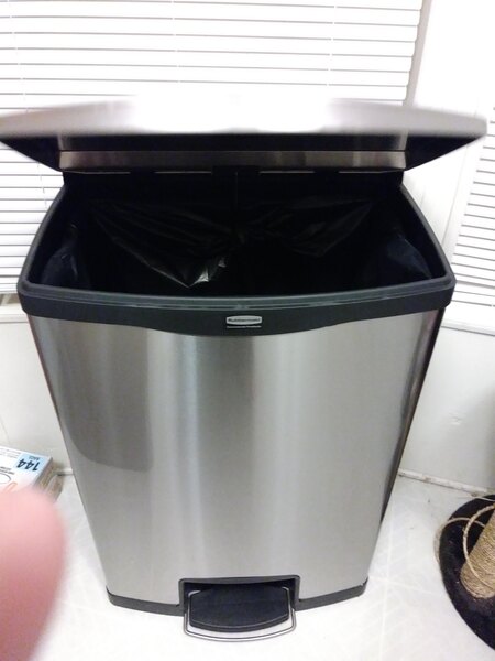 This Rubbermaid 1901999 Slim Jim Stainless Steel Black Accent Front Step-On Trash Can with Single Rigid Plastic Liner - 24 Gallon is pretty nice, it's not silent like it says, but it's pretty quiet when it closes, not much sound, very nicely built too. well worth the price.