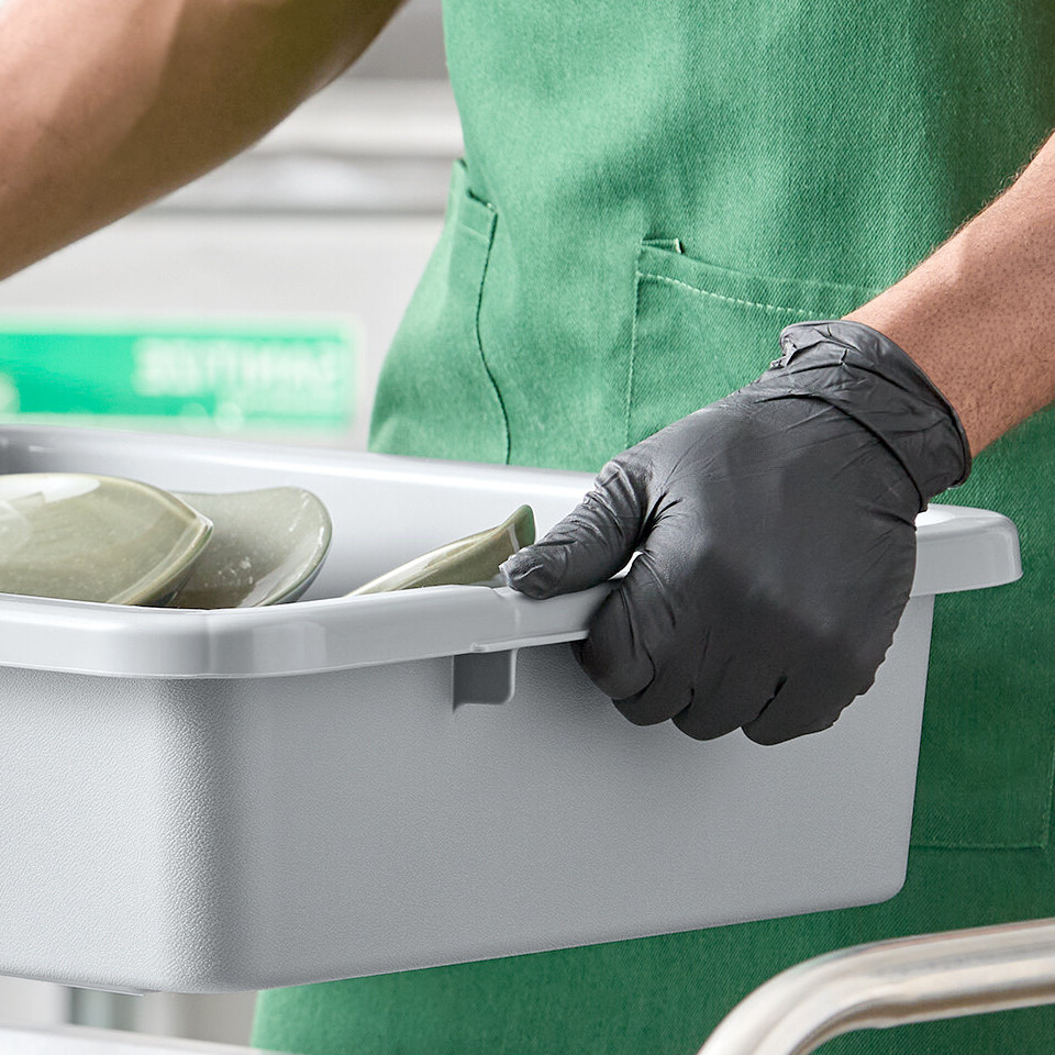 The ribbed interior bottom of this tub helps prevents plates, bowls, and glasses from sliding around excessively during transport, resulting in fewer broken dishes. Plus, the ribbed underside matches up with other tubs for easy, non-stick stacking!