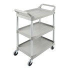 This Rubbermaid® FG342488OWHT utility cart / bus cart is perfect for performing a wide variety of tasks, including transporting food, dishes, glassware, chafers, and janitorial supplies. Its versatile design features four attractive brushed aluminum uprights, as well as three easy-to-clean smooth shelves.