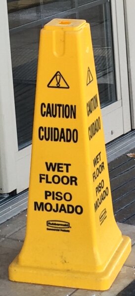 The Rubbermaid yellow bilingual cone shaped sign is good for bringing attention to potential hazards from wet surfaces. We use one in a tiled outdoor pathway to remind guests of potential slippery surfaces.