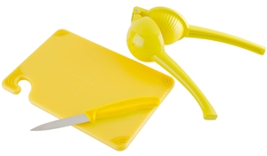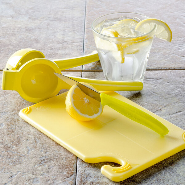 Searching for a convenient, color-coordinated solution for your kitchen or bar prep needs? With one yellow paring knife, one yellow hand-held squeezer, and yellow cutting board, this kit provides a time-saving experience. For those specializing in drinks based on fresh squeezed lemon juice, whether that be a bar, beverage kiosk, or coffee shop, this all-in-one package helps ensure fast and safe service to your customers. This collection is a must-have for any beverage stand or bar, and could also be used as a great gifting idea.