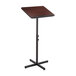 Provide your school, office, or conference center with an appropriate place to give professional presentations and lectures with this Safco 8921MH 21" x 21" x 46" mahogany / black adjustable speaker stand. This is the perfect piece for reading style presentations that don't require support equipment. Easy to set up, it has a strong wood laminate top with stylish black T-molding. The steel base includes floor levelers so you can have an optimal and even set up every time.
