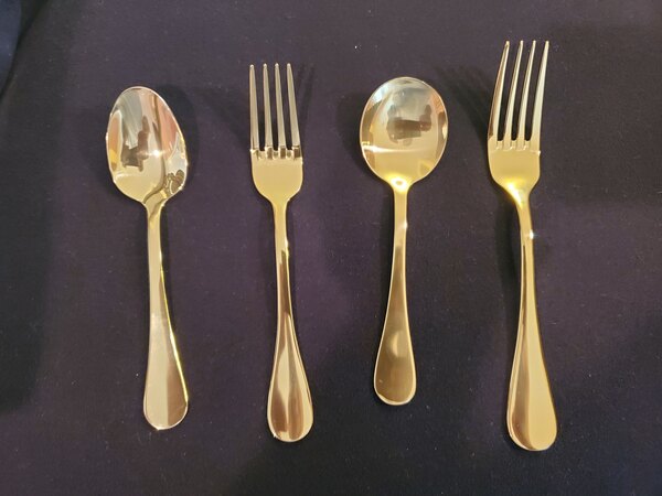By ordering this Acopa sample, you're able to touch and see it in person to ensure it meets all the unique requirements of your foodservice space before committing to the purchase of any full case from the Acopa Vernon line. Create a modern, trendy table setting with this Acopa Vernon Gold 18/0 stainless steel heavy weight flatware 5 piece sample set. Acopa's Vernon Gold collection combines both traditional and contemporary design elements to achieve a sleek, eye-catching look. Curved handles with rounded edges also supply a comfortable feel while beautifully capturing and reflecting light to deliver a polished presentation for your guests. Plus, every piece in this versatile collection is perfectly weighted and balanced to fit easily into your patrons' hands, while their simple silhouettes offer effortless style and elegance.