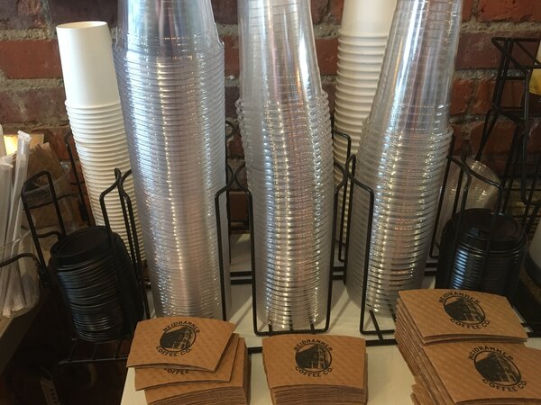 We use this on our do it yourself coffee bar. It holds cups, lids and sleeves. Has accessories that can also hold straws making it a complete station.