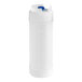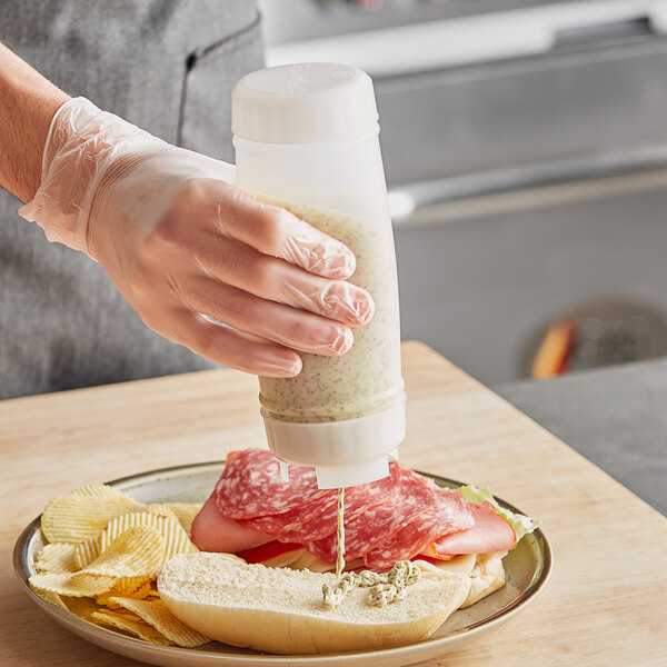 The durable yet flexible polyethylene bottle is easy to squeeze for fast application of tartar sauce or relish. It features a clear bottle to easily see how much sauce is left with a white cap and blue valve. Solid and valved caps are designed to fit on either end of the bottle. With its two wide mouths and smooth side walls, this bottle makes it simple to fill and dispense product, and it's easy to clean!