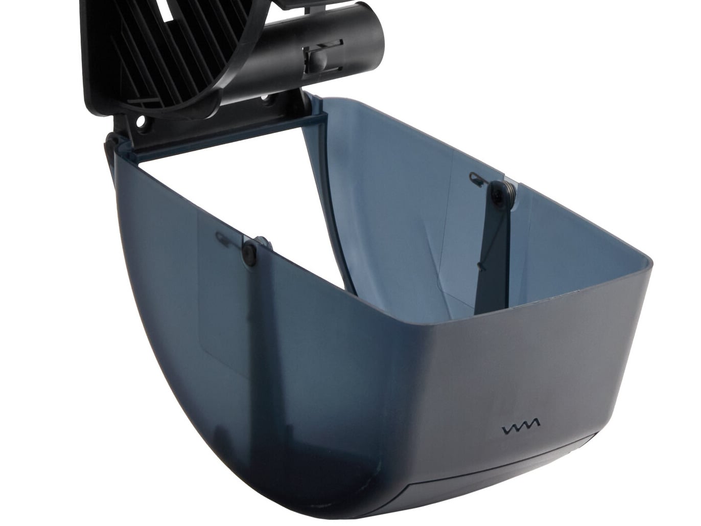 Thanks to a hinged cover design connected at the base of the unit, this dispenser opens a full 180 degrees to make it easy to refill.