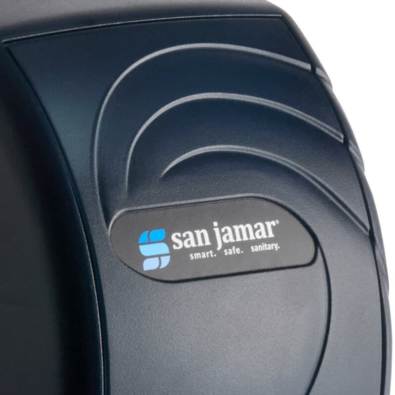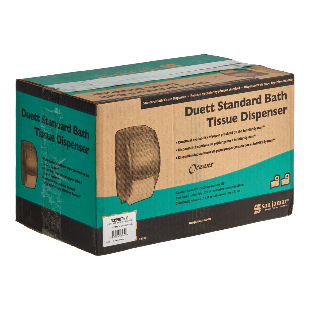 This San Jamar R3590TBK Duett Oceans toilet tissue dispenser is a smart addition to any commercial restroom. Both stylish and practical, it will complement your existing decor while providing ease of access to clean toilet paper for your guests. Not just easy to use and maintain, it's also durable, delivering a dependable toilet tissue paper dispensing solution that will meet the demands of any establishment.