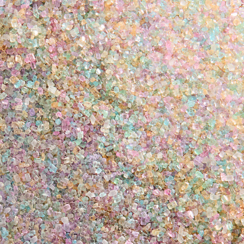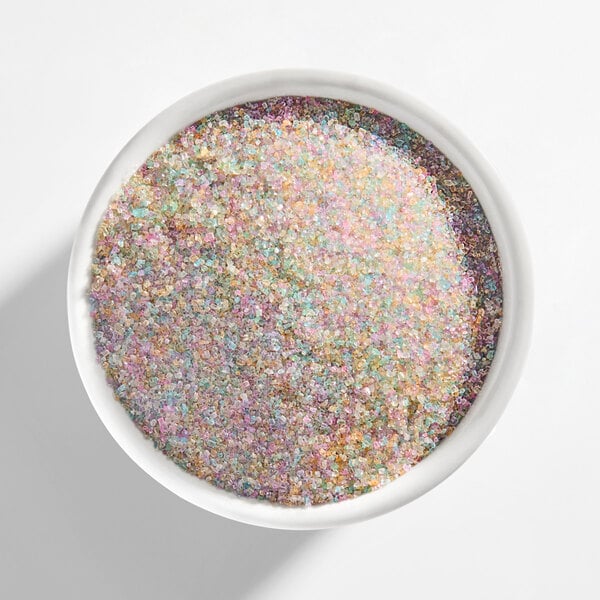 A great addition to any specialty baker and caterer's arsenal, this sanding sugar is ideal for decorating and garnishing cookies, scones, cupcakes, muffins, and candies. Featuring an eye-catching mix of pastel colors in every shade of the rainbow, this product makes it easy to decorate attractive baked goods. Its pastel rainbow color is great for matching your customer's event's color schemes or theme, creating festive sweets for the holidays, or simply for giving your treats a unique pop of color and glimmer!