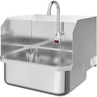 Maintain a sanitary environment in your facility by giving your staff a convenient way to quickly wash their hands with this Sani-Lav 19" x 18" wall-mounted hand sink with 1 battery-powered faucet and side splashes! Made with durable 18 gauge type 304 stainless steel with a sleek electropolished finish, this durable sink is rust- and corrosion-resistant, helps reduce bacterial growth, and is built for everyday commercial use. For safety, the outer edge of the sink bowl is curled under to eliminate any sharp edges. Perfect for service industry applications, this easy-to-clean sink will keep your employees healthy.