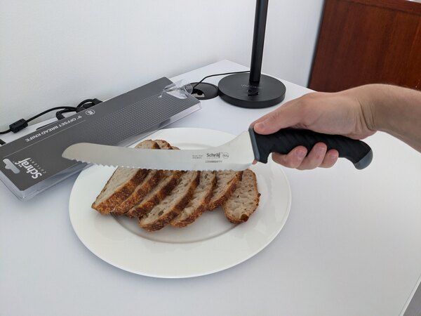 I really like these knives! This serrated bread knife has been so reliable for slicing rolls on my food truck. Comfortable hand grip, easy to hold.