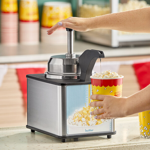 The unit can also hold a #10 can. Whether dispensing from the container or a can, the unit's stainless steel pump produces consistent portions to help prevent waste. This portion size adjusts easily in 1/8 oz. increments up to 1 oz. Plus, the spout is heated, so the buttery topping stays warm when dripping onto the popcorn.