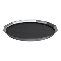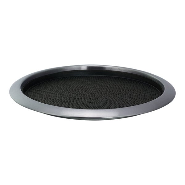 Enhance your bar or restaurant service with this Service Ideas Metallic Elements 14" round serving tray! Crafted from durable 18/8 stainless steel, this tray is built to withstand the demands of a busy establishment. The brushed finish paired with a sleek black insert creates a modern and sophisticated look that will impress your guests. The removable non-slip silicone rubber insert ensures that glasses and dishes stay securely in place during transport, reducing the risk of spills and accidents, while the bottom of the tray has a rubber coating that helps prevent slipping. Plus, the removable insert can be taken out and replaced with a doily (sold separately) for a more upscale presentation.