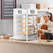 When this warmer is installed on your counter, it will draw in customers with bright LED lighting and decals on three sides of the unit. It has four glass sides so customers can see your delicious pies or savory snacks from any angle, and the single glass door allows simple loading or unloading.