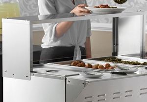 An attached acrylic sneeze guard panel helps to shield your culinary creations from harmful pathogens. It even features a top shelf where guests can rest their plates as employees serve.
