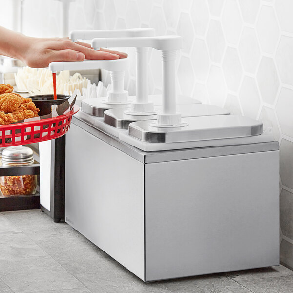 Serve your condiments with efficiency with the ServSense™ 2 qt. stainless steel condiment dispenser with triple plastic pump and plastic fountain jar!