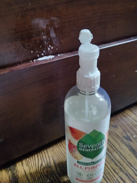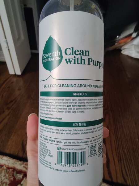 I really like the scent, mist stream, and upfront ingredients of this spray. I can use it for household surfaces and books, toys, etc. It's streakier than my Method spray, but I'm willing to take that if it's greener