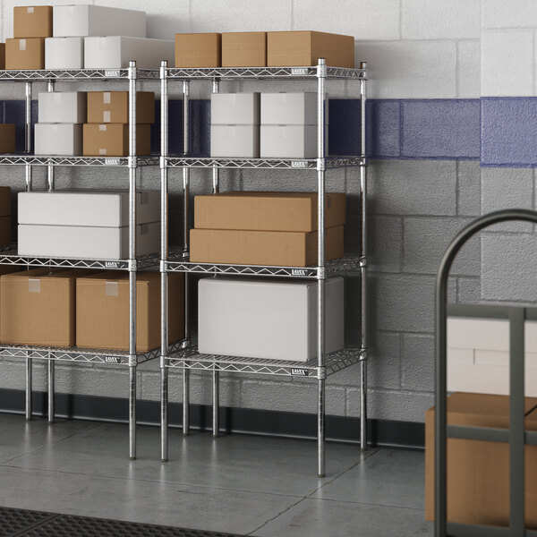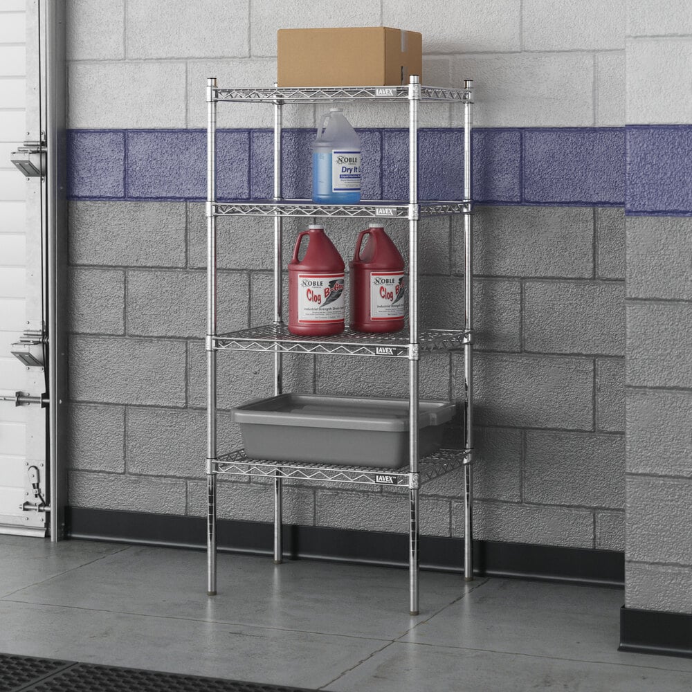 Designed for use in dry environments, this shelving unit is an excellent choice for organizing and maximizing storage space. Whether you're looking to streamline your warehouse operations or simply need additional storage in your industrial facility, this heavy-duty shelving kit is the perfect solution. Mix and match with Lavex Pro accessories (sold separately) to personalize your kit! Invest in the Lavex Pro chrome heavy-duty 4-shelf kit and experience the durability and functionality it brings to your workspace.