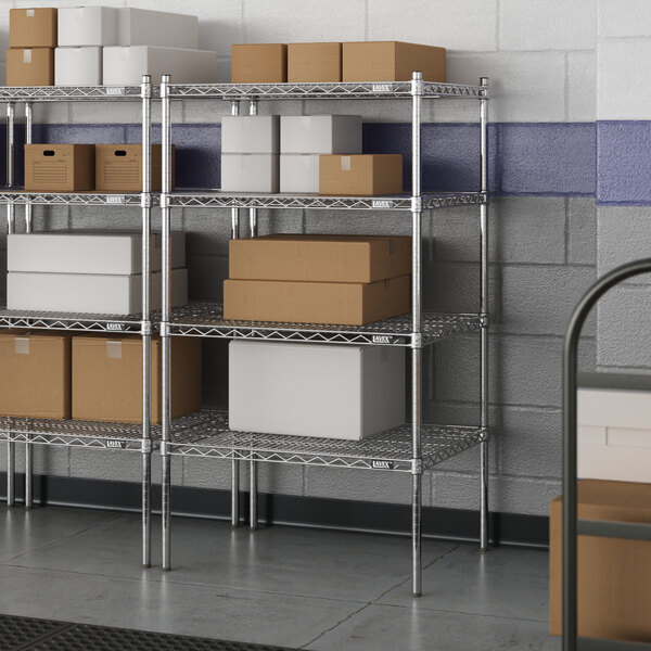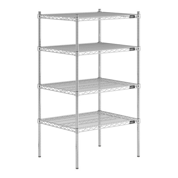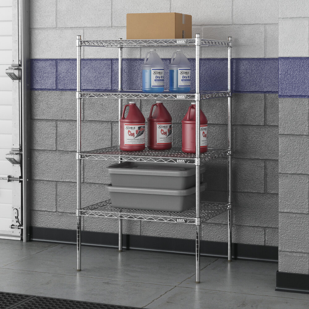Designed for use in dry environments, this shelving unit is an excellent choice for organizing and maximizing storage space. Whether you're looking to streamline your warehouse operations or simply need additional storage in your industrial facility, this heavy-duty shelving kit is the perfect solution. Mix and match with Lavex Pro accessories (sold separately) to personalize your kit! Invest in the Lavex Pro chrome heavy-duty 4-shelf kit and experience the durability and functionality it brings to your workspace.