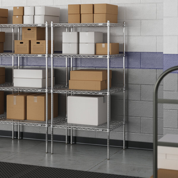 Designed for use in dry environments, this shelving unit is an excellent choice for organizing and maximizing storage space. Whether you're looking to streamline your warehouse operations or simply need additional storage in your industrial facility, this heavy-duty shelving kit is the perfect solution. Mix and match with Lavex Pro accessories (sold separately) to personalize your kit! Invest in the Lavex Pro chrome heavy-duty 4-shelf kit and experience the durability and functionality it brings to your workspace.