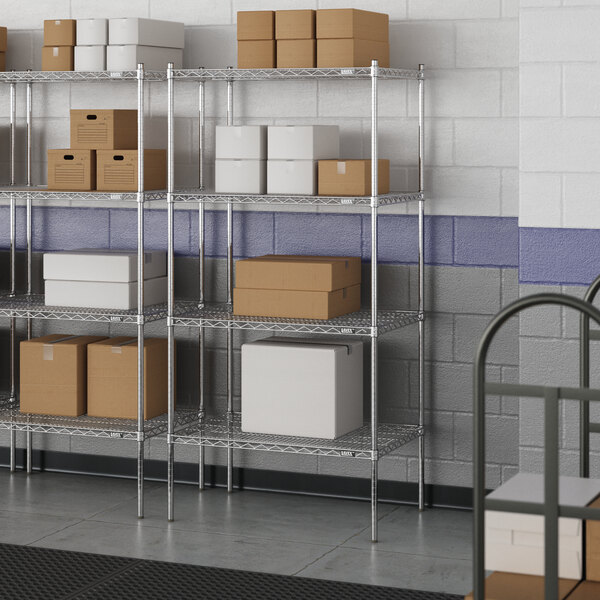 Designed for use in dry environments, this shelving unit is an excellent choice for organizing and maximizing storage space. Whether you're looking to streamline your warehouse operations or simply need additional storage in your industrial facility, this heavy-duty shelving kit is the perfect solution. Mix and match with Lavex Pro accessories (sold separately) to personalize your kit! Invest in the Lavex Pro chrome heavy-duty 4-shelf kit and experience the durability and functionality it brings to your workspace.