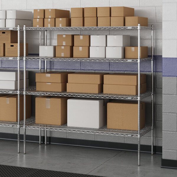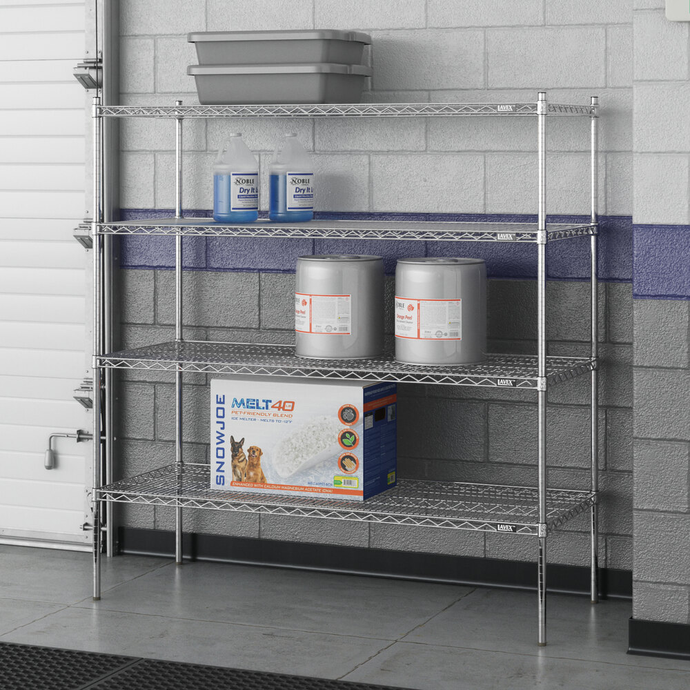 Designed for use in dry environments, this shelving unit is an excellent choice for organizing and maximizing storage space. Whether you're looking to streamline your warehouse operations or simply need additional storage in your industrial facility, this heavy-duty shelving kit is the perfect solution. Mix and match with Lavex Pro accessories (sold separately) to personalize your kit! Invest in the Lavex Pro chrome heavy-duty 4-shelf kit and experience the durability and functionality it brings to your workspace.