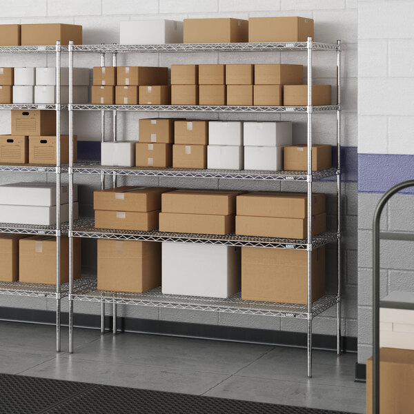 Designed for use in dry environments, this shelving unit is an excellent choice for organizing and maximizing storage space. Whether you're looking to streamline your warehouse operations or simply need additional storage in your industrial facility, this heavy-duty shelving kit is the perfect solution. Mix and match with Lavex Pro accessories (sold separately) to personalize your kit! Invest in the Lavex Pro chrome heavy-duty 5-shelf kit and experience the durability and functionality it brings to your workspace.