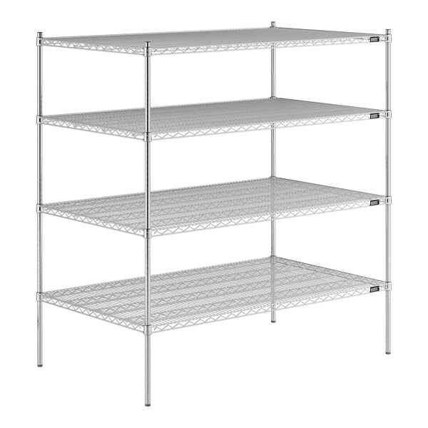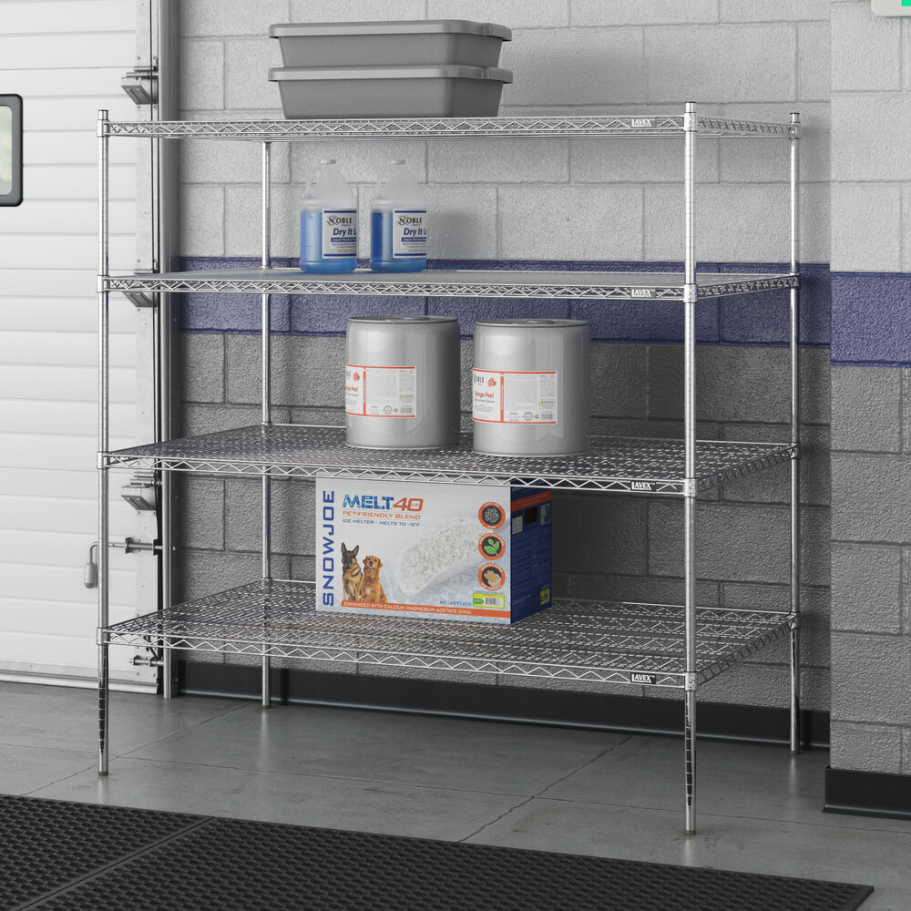 Designed for use in dry environments, this shelving unit is an excellent choice for organizing and maximizing storage space. Whether you're looking to streamline your warehouse operations or simply need additional storage in your industrial facility, this heavy-duty shelving kit is the perfect solution. Mix and match with Lavex Pro accessories (sold separately) to personalize your kit! Invest in the Lavex Pro chrome heavy-duty 4-shelf kit and experience the durability and functionality it brings to your workspace.