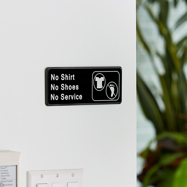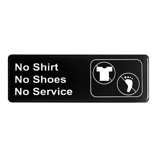Let customers know about your establishment's policies with this Lavex 9" x 3" black and white no shirt, no shoes, no service sign!