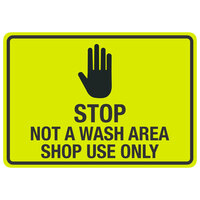 Clearly direct visitors and patrons with this "Stop / Not A Wash Area / Shop Use Only" engineer-grade reflective black / yellow aluminum sign with symbol. Built for enhanced visibility, this item is bound to encourage proper protocol in high-volume consumer traffic environments. While its vibrant yellow backdrop helps to draw attention, its bold black text allows for easy readability. Plus, by alerting customers as to where they cannot enter, this item is sure to reduce confusion and keep shop areas more secure. The sign even features a distinctive graphic for better comprehension. Place it near your inventory doors to promote superior safety for employees and guests alike.