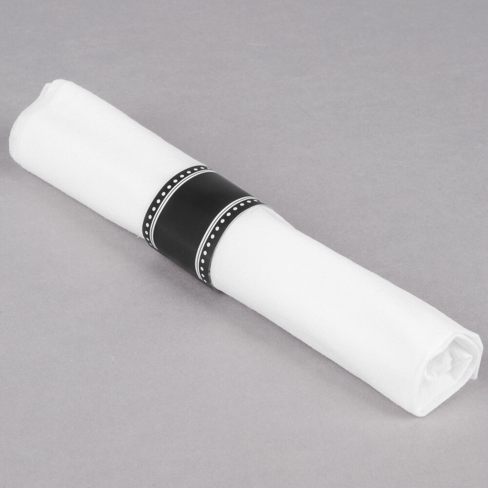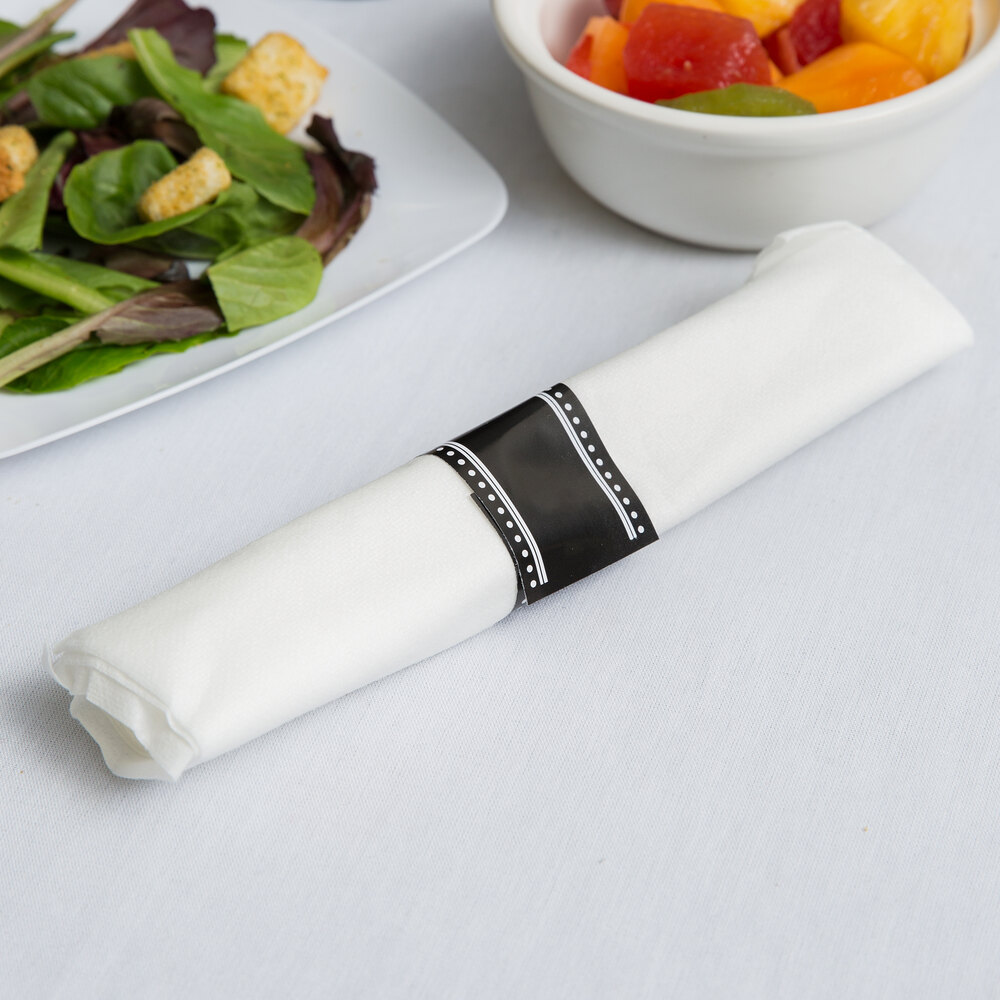 A black and white self-adhering napkin strap keeps the set tightly wrapped for a neat and pristine appearance.