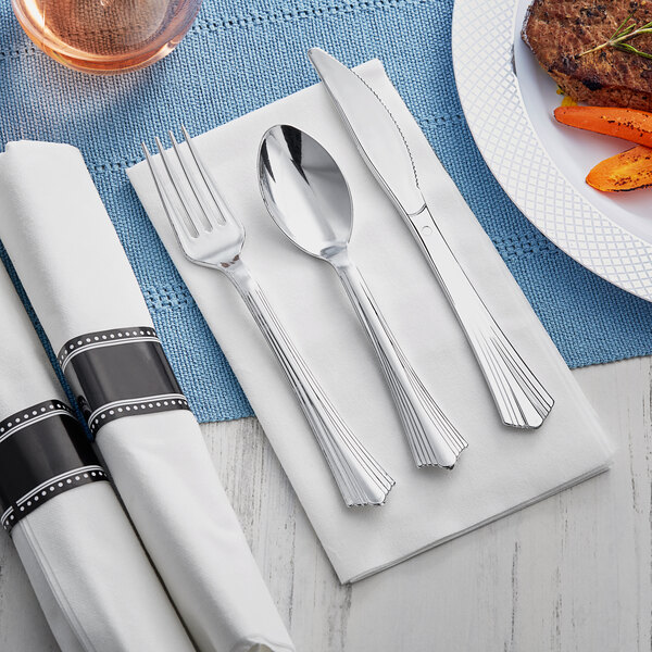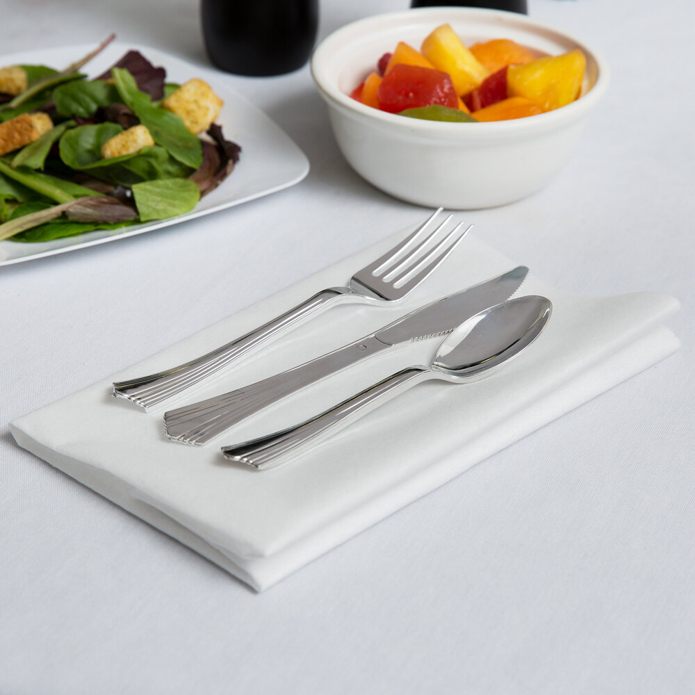- Item #: 130rollkfssvVisions Fluted 17" x 17" Pre-Rolled Linen-Feel White Napkin and Silver Extra Heavy Weight Plastic Cutlery Set - 100/Case