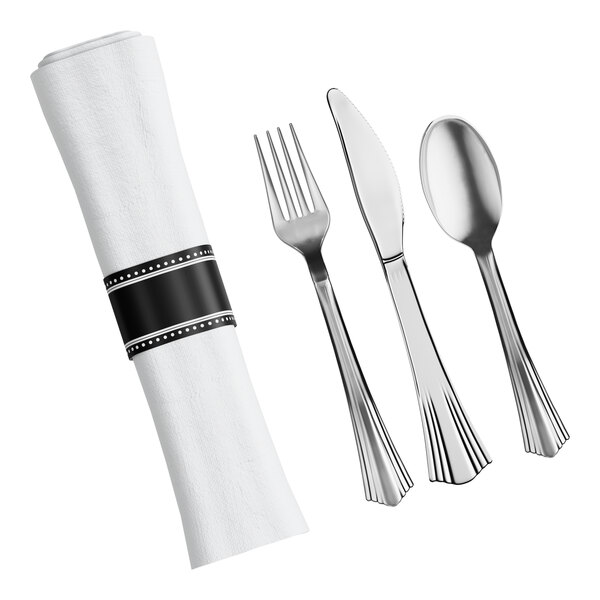 Pre-rolled and ready-to-use, you'll save time and labor at catering events and wedding receptions with this pre-rolled linen-feel white napkin and silver extra heavy weight plastic cutlery set. This all-in-one set is easy for your patrons to carry from the buffet to their table and is conveniently disposable for a quick cleanup!