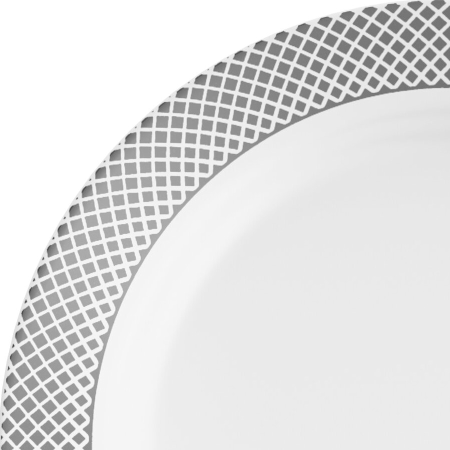 A contemporary silver lattice pattern along the wide outer rim serves as a striking contrast to the stark white body of this plate. It's sure to draw attention while adding an upscale look to your wedding receptions, banquets, or other catered events.